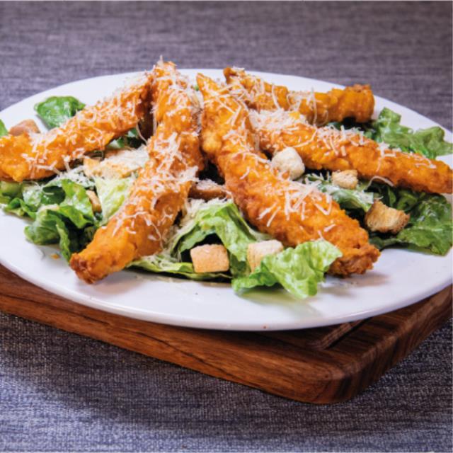 Nuestra tradicional ensalada César coronada con 220 g de tiras de pechuga de pollo fritas y